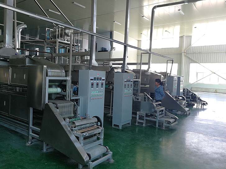 麗星粉皮生產(chǎn)線采用室內(nèi)作業(yè)制粉理念,升級蒸汽換熱系統(tǒng),從淀粉和漿到定長橫切出機自動化、流水線作業(yè),原料只需薯類淀粉和食用水。